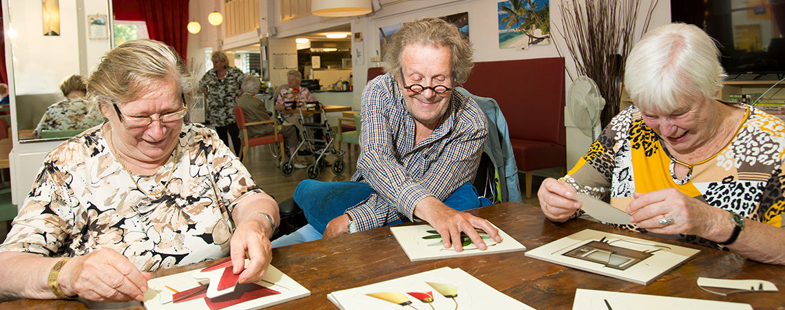 Leuke vragen- en reminiscentiespellen zoals Wablief Vergeetwoorden, Blik op Vroeger, Mannenvragen, het Spreekwoordenspel of de spieren oefenen met een pot sjoelen, kegelen of Japans biljart, of speel samen Vragenderwijs Rood of Seizoenenspel, gegarandeerd veel lol en interactie. Maar ook de leukste puzzels voor mensen met dementie en speciale instrumenten om muziek te maken en knutsel- en schildermateriaal. Spelletjes brengen mensen samen en helpen actief te blijven. Dat is gezond en leuk!